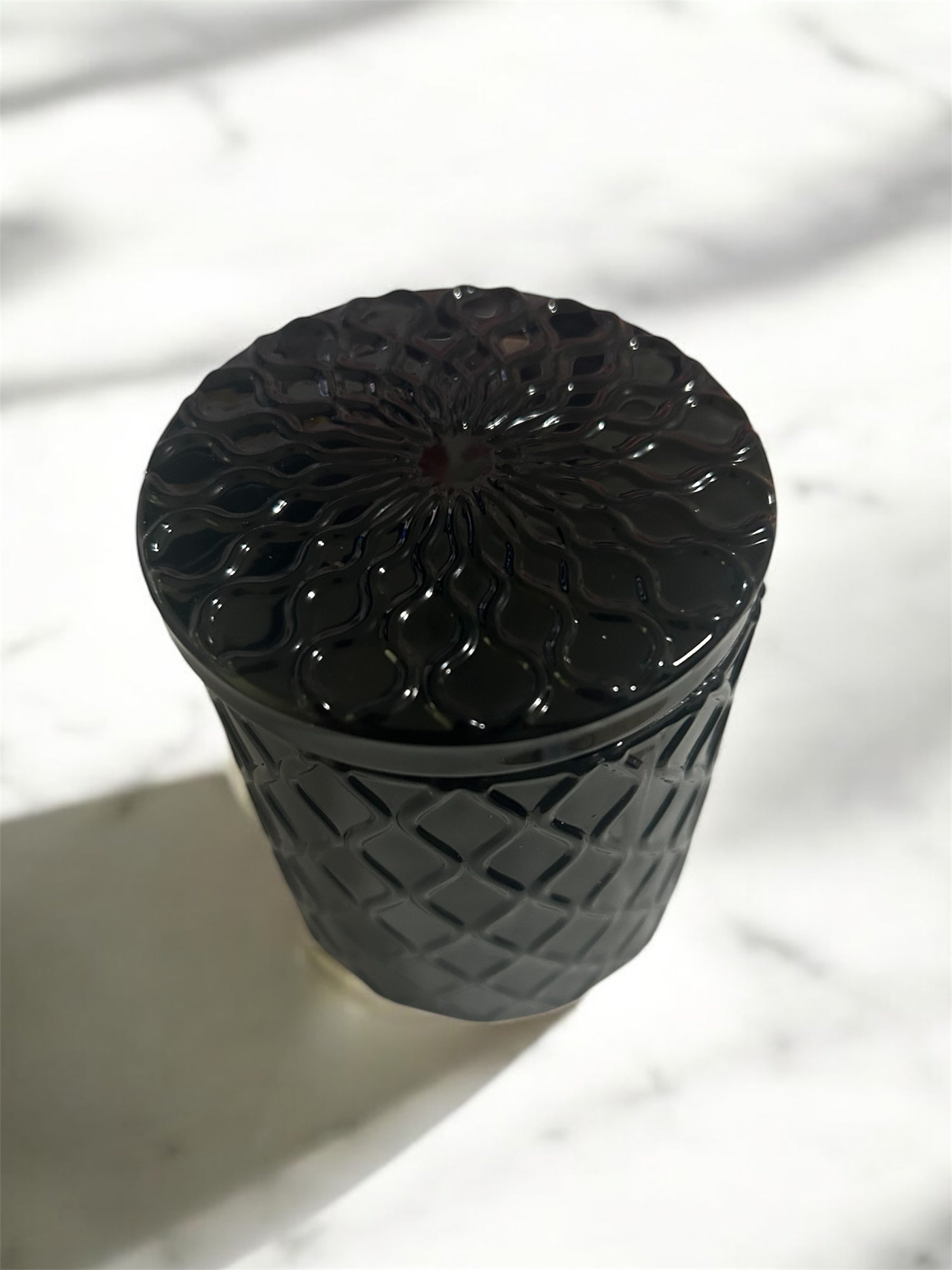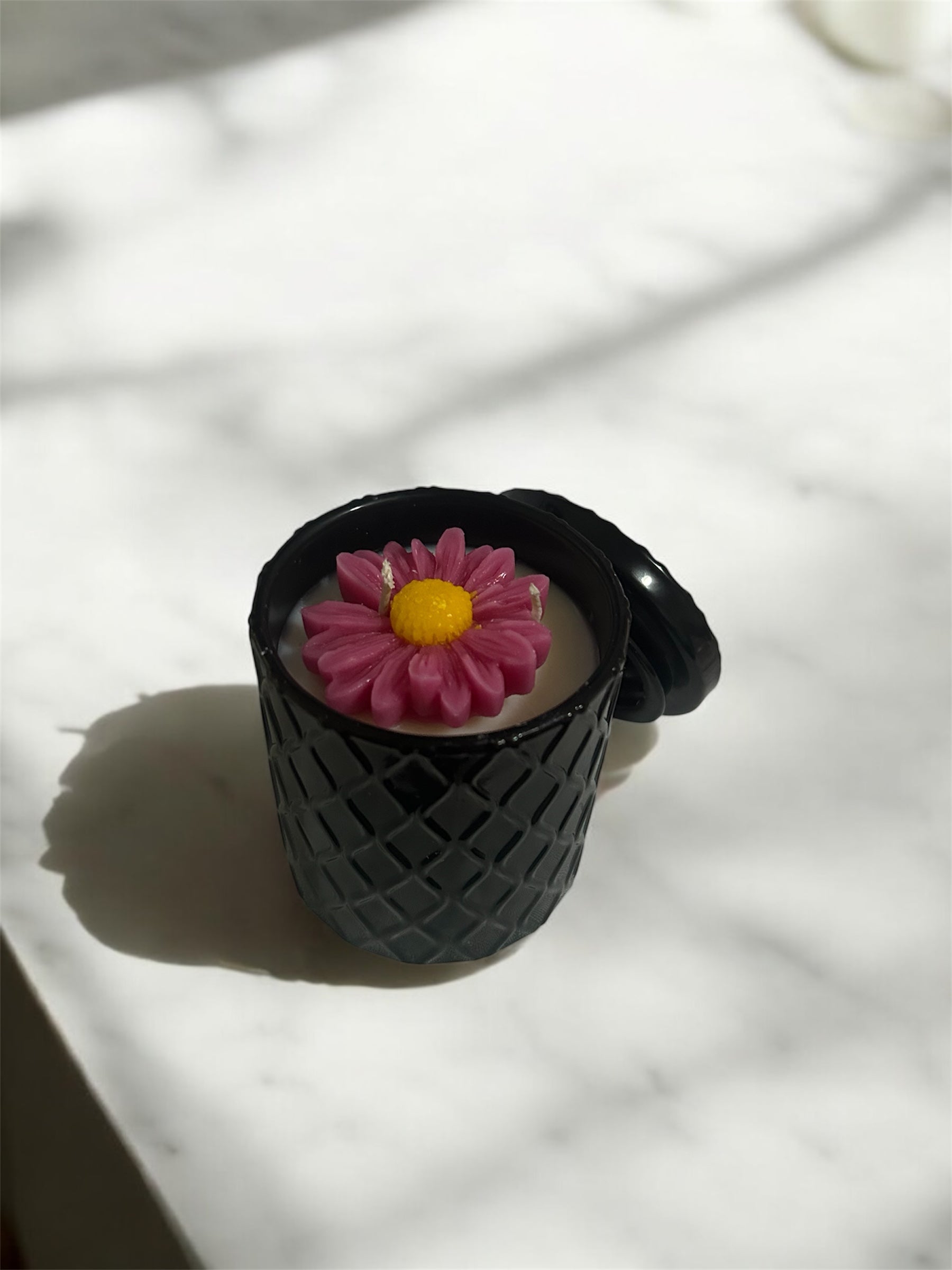 This elegant glass jar candle features a beautifully crafted wax flower at its center, adding both charm and artistry to your space. The container showcases a textured geometric design that enhances its aesthetic appeal, making it ideal for gifting, relaxation, or stylish home décor. With dual wicks for an even burn and a sculpted floral centerpiece, it’s more than a candle—it’s a statement piece.