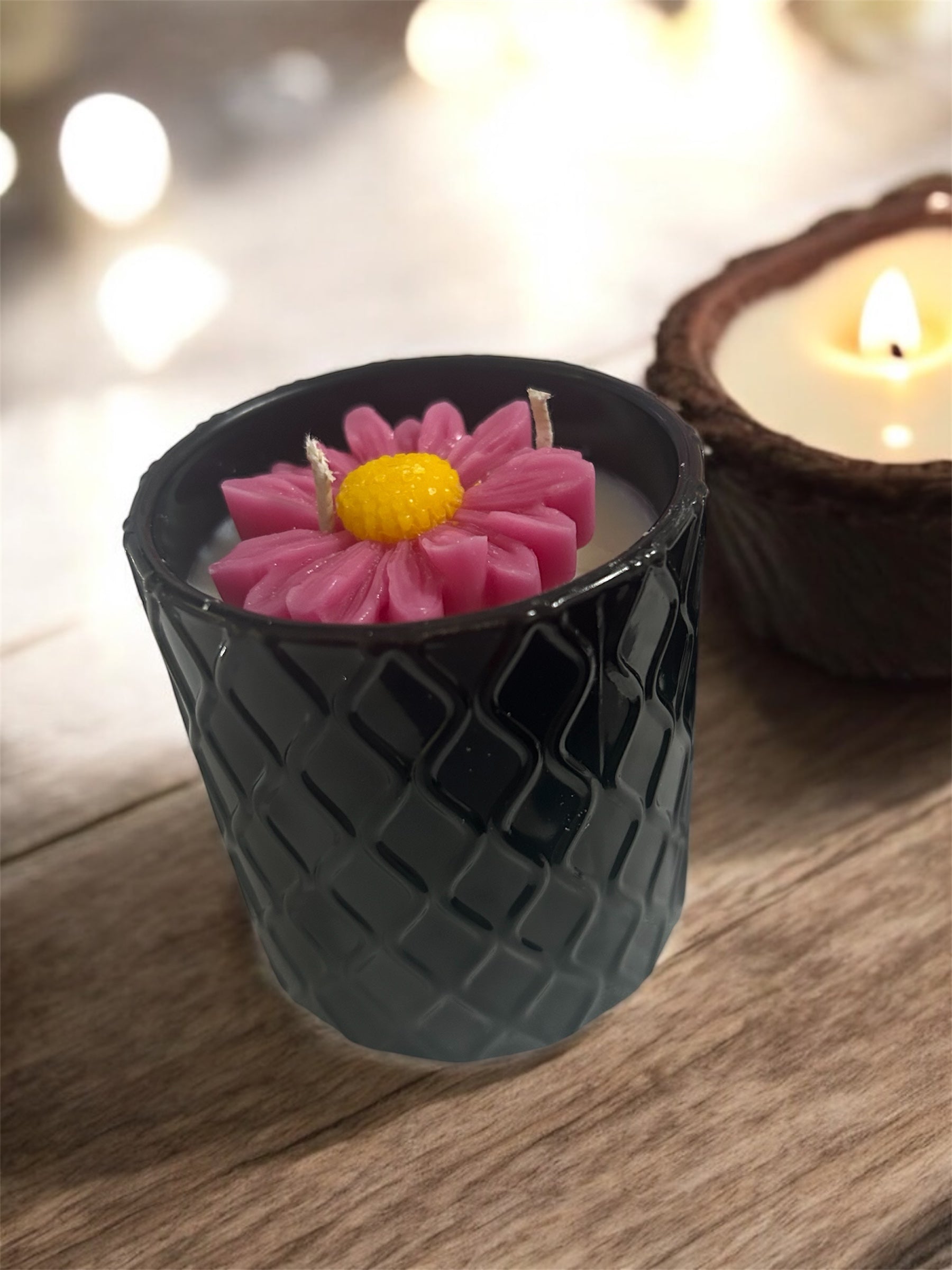 Glass Candle with Sculpted Floral Center – Handmade Decorative Jar Candle