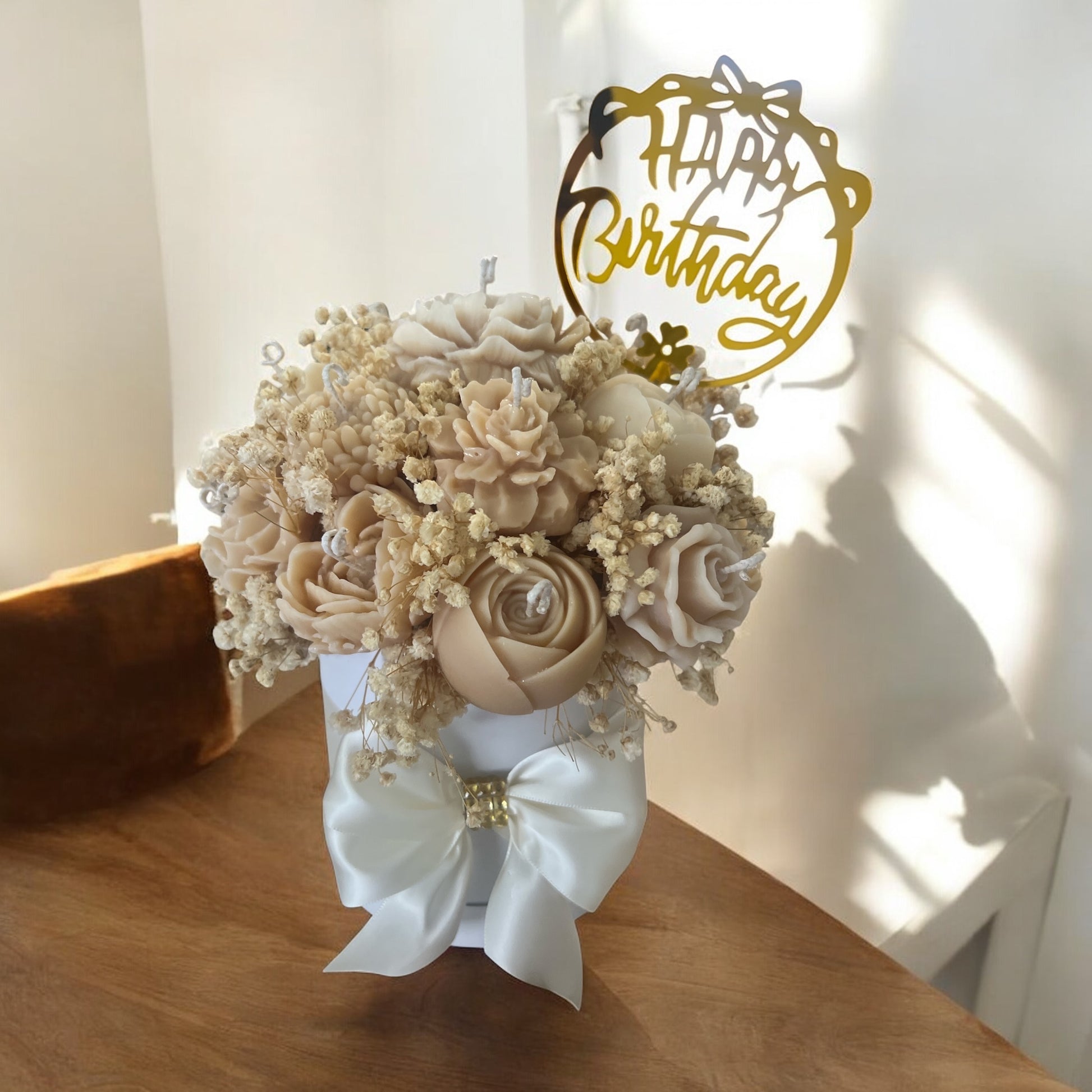 Delicate, refined, and timeless — Ivory Whisper is a handcrafted candle arrangement designed for those who cherish elegance in simplicity. Featuring hand-sculpted wax flowers in soft ivory and beige tones, this bouquet radiates warmth and serenity. Accented with dried florals and presented in a minimalist white round box with a satin bow, it’s the perfect piece for weddings, memorial gifts, or neutral-toned home décor.