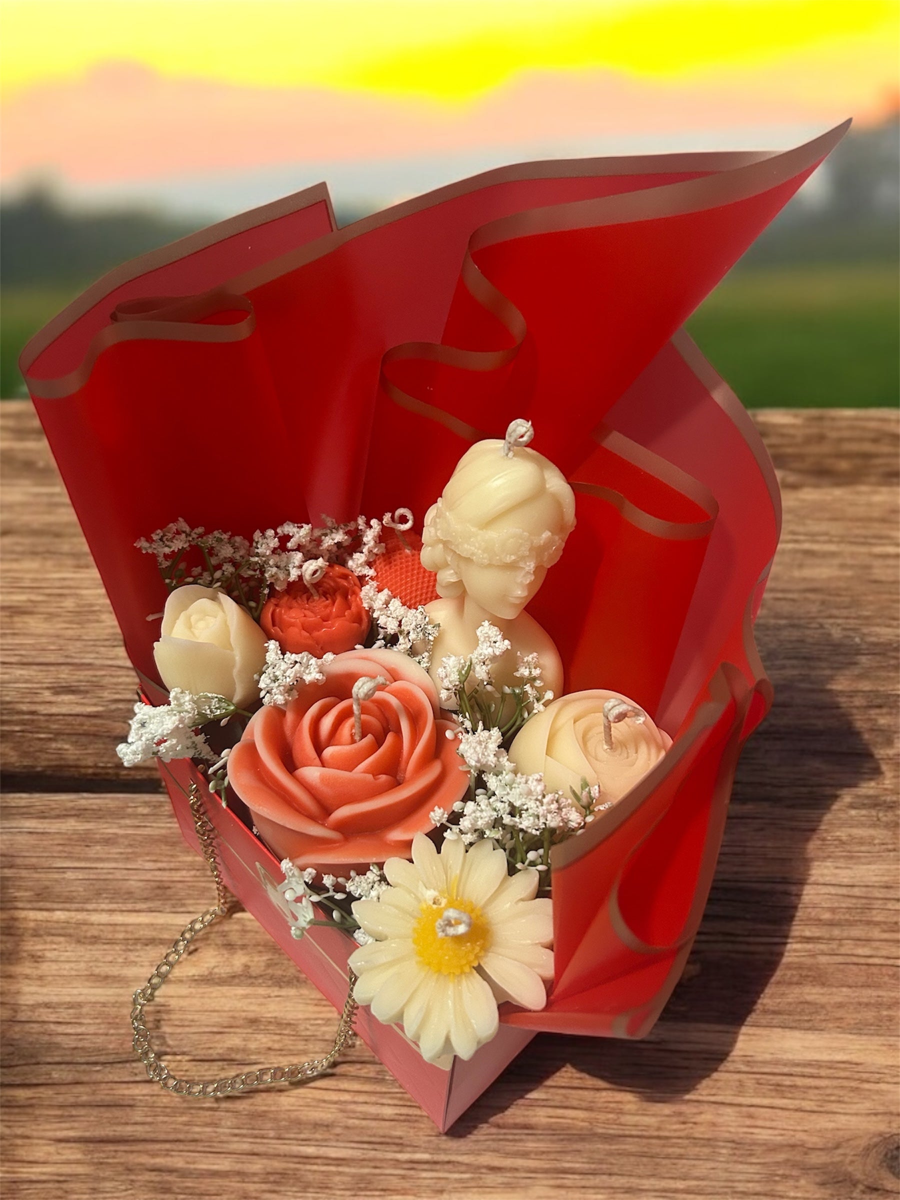 Surprise someone special with this stunning luxury candle arrangement, presented in a sophisticated red gift tote with golden chain details. Inside, you'll find an enchanting mix of hand-sculpted floral candles and a classical bust figure, surrounded by delicate faux florals for an artistic and romantic touch. Ideal for birthdays, anniversaries, or high-end gifting, this unique piece is both a decorative treasure and a fragrant delight.