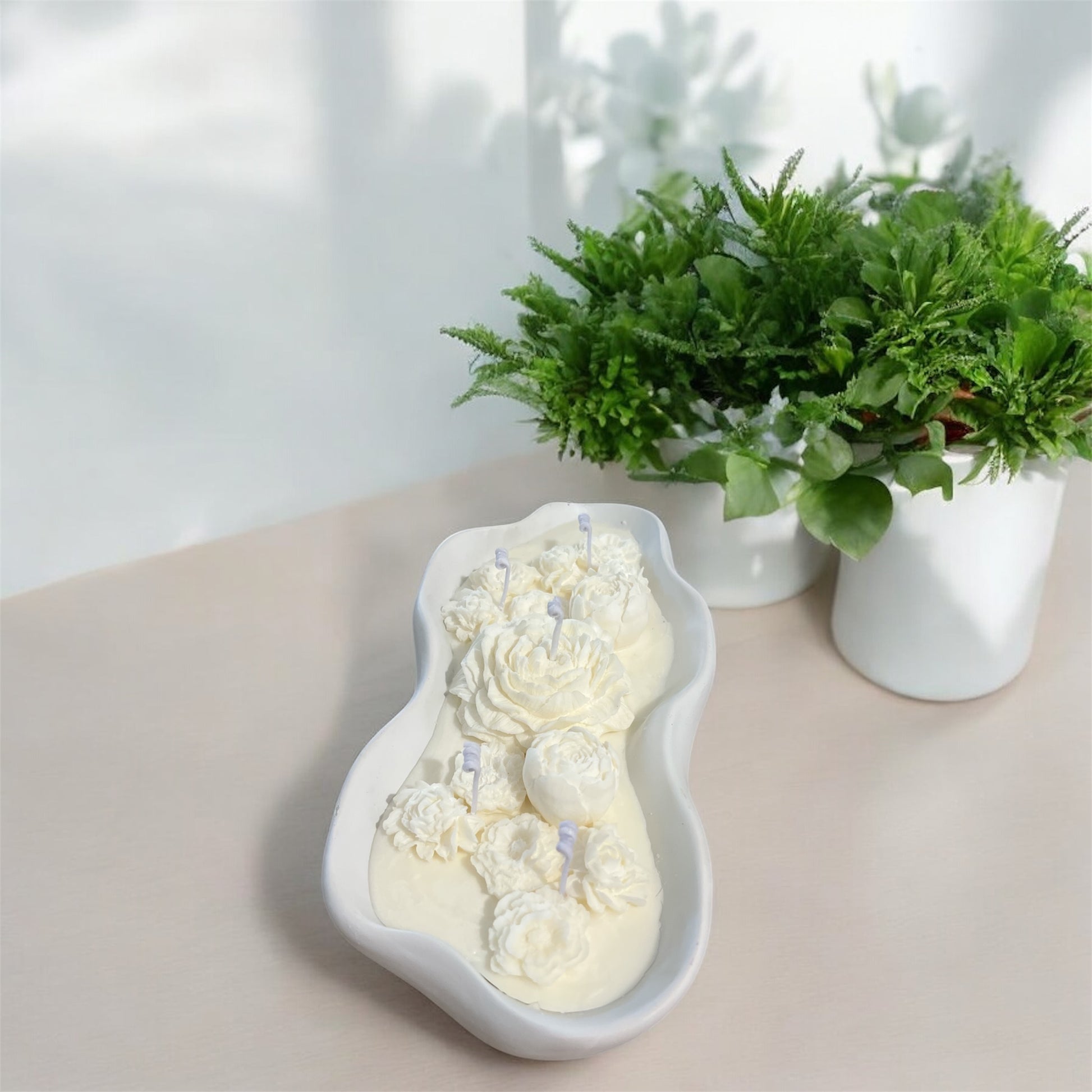Infuse your space with serenity and elegance with our Luxury White Garden Bowl Candle. Set in a sleek, organically shaped white ceramic bowl, this sculpted floral candle features meticulously crafted blooms in pristine white wax—each wick ready to bring warmth and sophistication to your home.