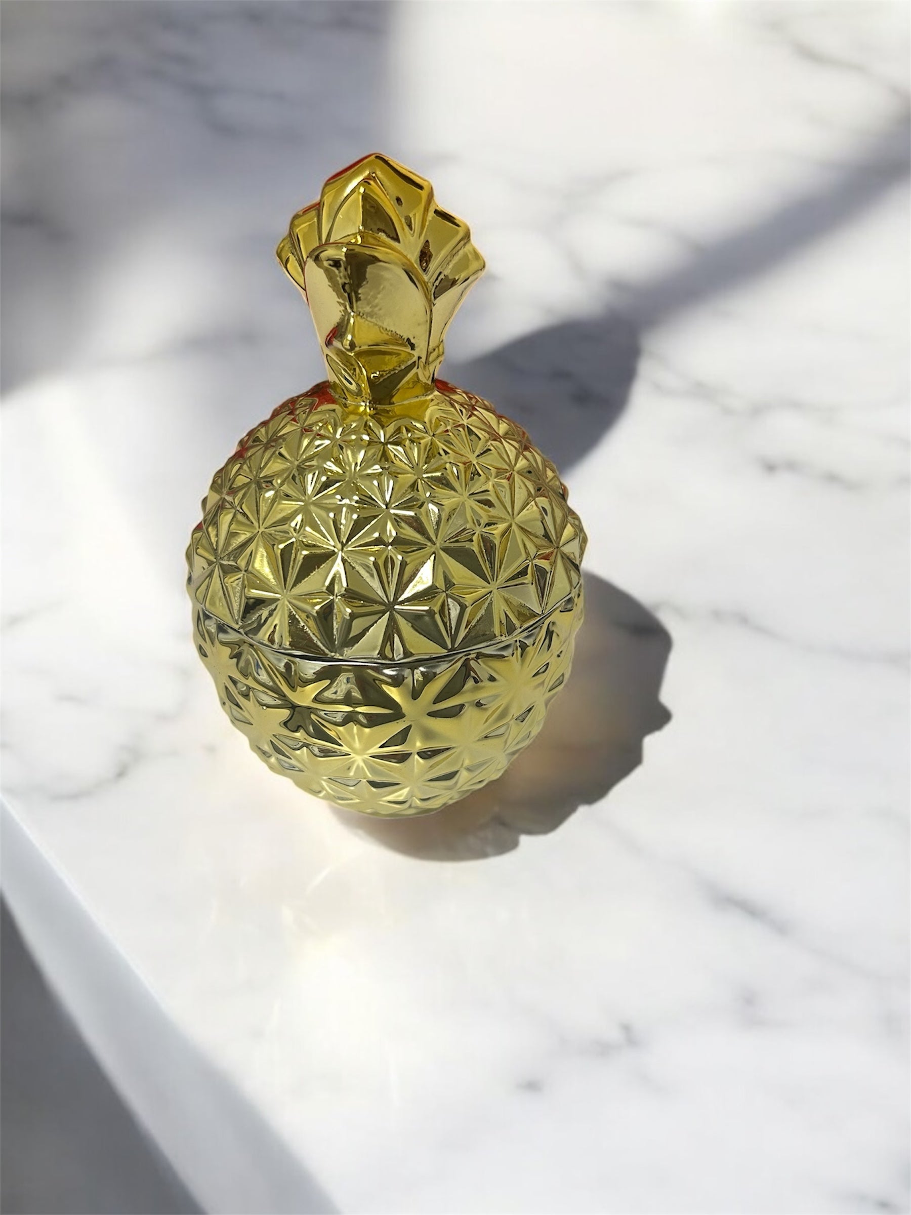 Add a touch of luxury to your space with this pineapple-shaped candle jar, featuring a beautifully detailed floral wax centerpiece inside. The ornate container showcases a geometric pineapple design with a high-shine finish, perfect for reuse as home décor even after the candle is gone. Inside, a hand-poured wax flower with dual wicks creates a stunning focal point for gifting, display, or relaxation rituals.